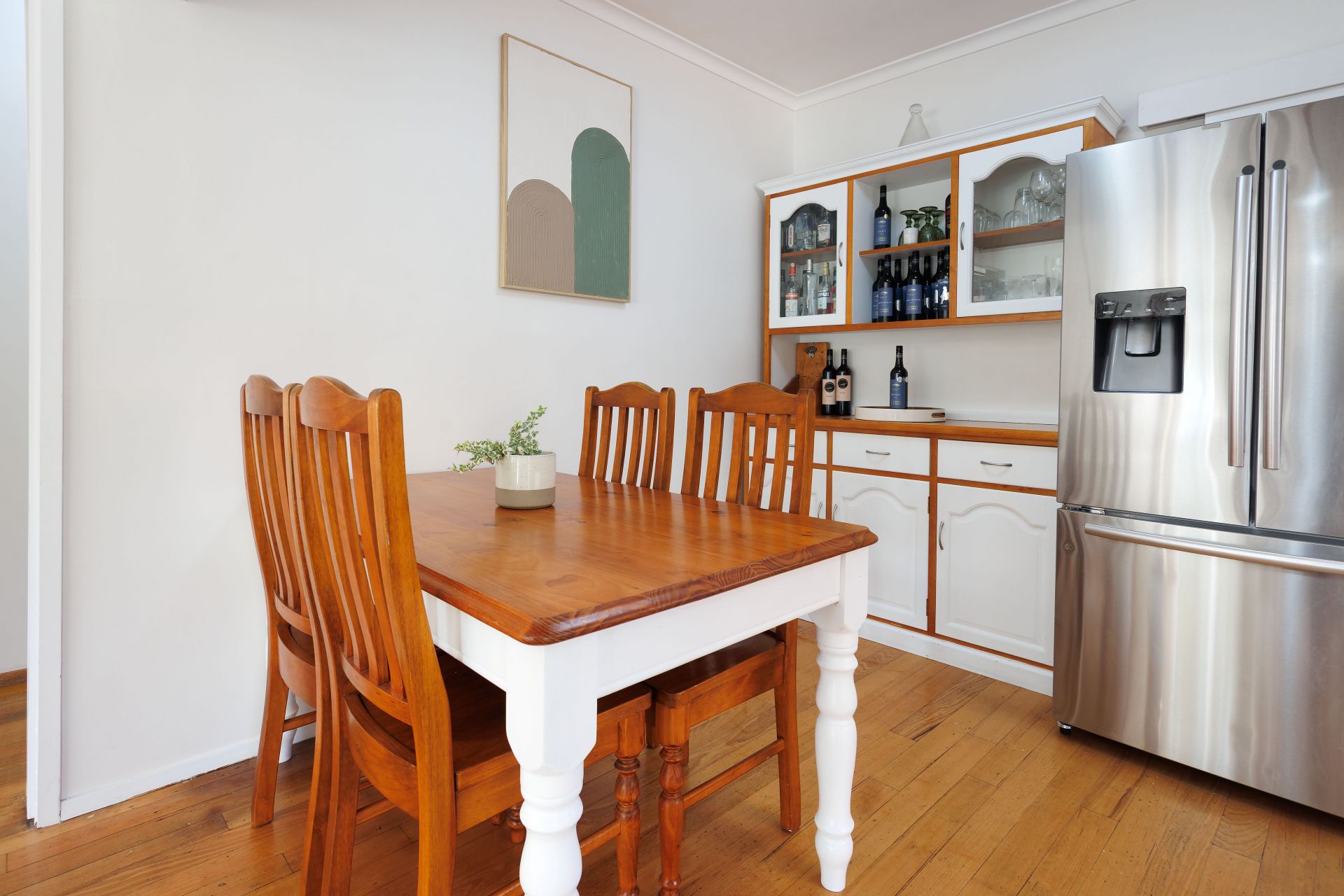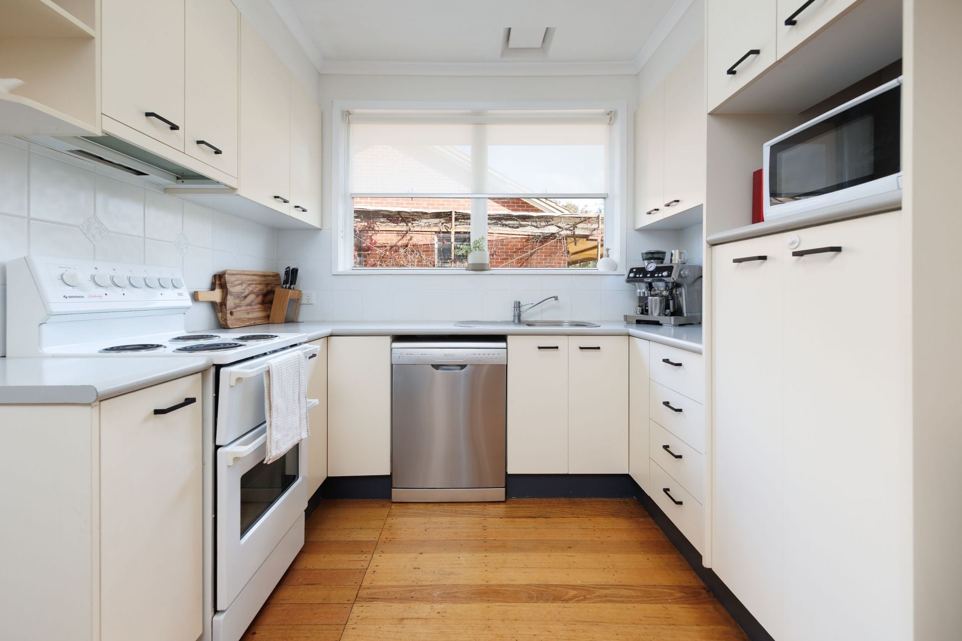 The updated kitchen is equipped with electric cooking, a dishwasher, ample cupboard storage, and flows seamlessly into the adjoining dining area.